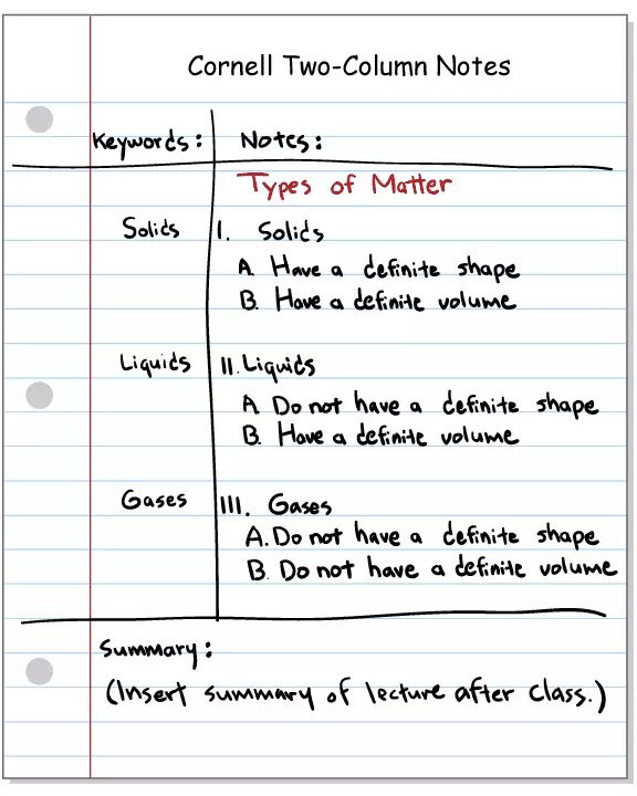 举例:下面的例子是物理学中物体三种形态的笔记,左端记录的是三个关键词“固体”、“液体”和“气体”,右端则对应地记录下这三种形态的特点,最下端应该在课后插入一段简短的总结。