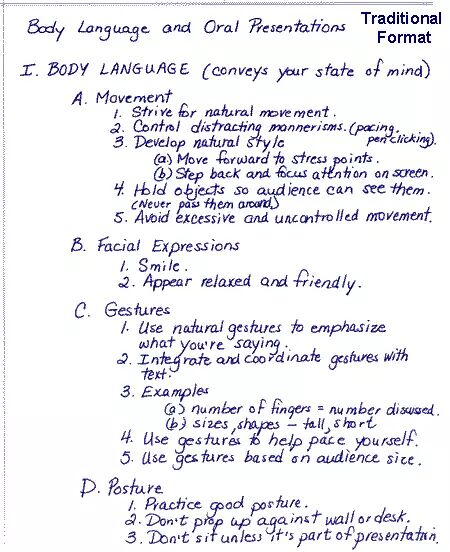 下面使用提纲笔记法记录的是如何进行一场好的演讲。置于最左边的最高级是“肢体语言”,在这一大类别下的四个小类别稍微向右缩进,分别是“动作”、“表情”、“手势”和“姿势”,然后在这四个小类别下的具体描述则再向右继续缩进。比如在“表情”下面有两个更小的描述:微笑,放松并友好。