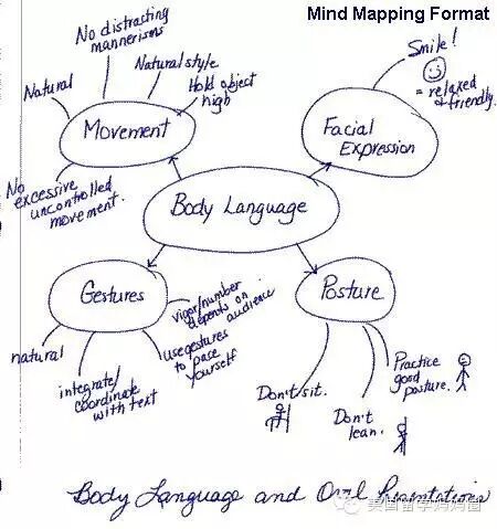与提纲笔记法举例中的内容是一样的,但形式却很不一样。以“肢体语言”作为最原始的出发点,然后发散出四个小分类“动作”、“表情”、“手势”和“姿势”,四个小分类之后再继续发散出各自的详细说明。