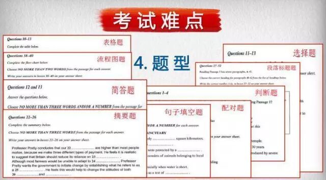通过以上这张图可以发现,判断题、选择题、配对题、摘要题、段落标题题是常见的5大题型,但是任何考试中不能够断定一定会出现哪些题型,所以每种题型学生都需要灵活掌握
