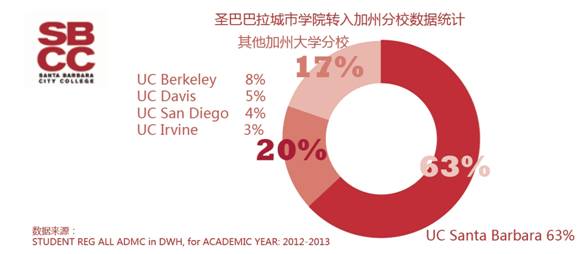 如果学生在社区大学毕业后想继续深造进修,也可以转读四年制大学,直接申请报读大三的课程,继续后两年的大学课程,取得学士学位。 因为在美国不管是二年制大学还是四年制大学,实行的都是学分制,所以学生只要修满升学的学分,GPA达到要升入四年制大学的要求,就能直接升学进入大三。 圣巴巴拉城市学院 加州大学圣巴巴拉分校:63% 加州大学伯克利分校:8% 加州大学圣地亚哥分校:4% 加州大学欧文分校:3% 其他加州大学分校:17% 米拉科斯塔学院 加州大学圣地亚哥分校:53% 加州大学洛杉矶分校:10% 加州大学伯克利分校:8% 加州大学圣巴巴拉分校:6% 加州大学欧文分校:6% 加州大学戴维斯分校:5% 其他加州大学分校:12% 伯克利城市学院 加州大学伯克利分校:48% 加州大学戴维斯分校:18% 加州大学洛杉矶分校:11% 加州大学圣地亚哥分校:7% 加州大学圣巴巴拉分校:5% 加州大学欧文分校:1% 其他加州大学分校:10%