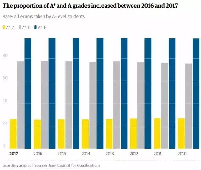 从2010至2017年英国A-level的成绩数据来看,各成绩段分布比例稳定,年变化很小。今年获得A以及A*成绩的学生比例为26%,相比2016年增长0.5%,实现了2011年以来的首次增长。根据卫报解读,这一“增长”源于男生成绩的提高。
