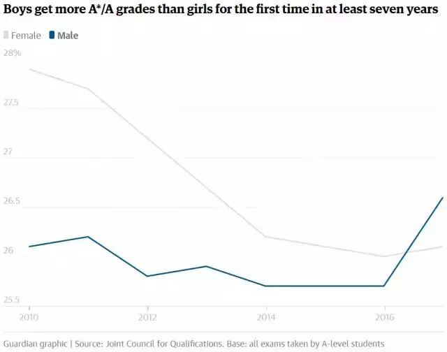 2017年A-level考试中,获得A以及A*成绩的男生比例为26.6%,女生比例26.1%,这也是近7年来男生在高分成绩上的表现首次超过女生。