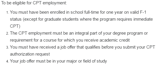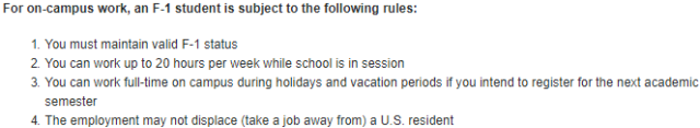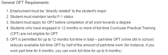 无需申请特别许可 上学期间打工每周时长最多20小时,假期则为最多40小时/周 2)校外工作(off-campus job)分为CPT ( Curricular Practical Training )和OPT (Optional Practical Training) 3)CPT ( Curricular Practical Training ) 上学期间适用 F-1签的留学生,第一年不可以进行校外打工 需要申请打工许可 CPT实习需与所学习的课程相关 CPT的累计时间最多12个月,超过12个月则毕业时无法申请OPT CPT分为兼职(每周最多工作20小时)和全职(40小时/周) 4)OPT (Optional Practical Training) 毕业前90天可以开始申请 CPT时间超过12个月则不可再申请OPT 大部分专业学生OPT时间不超12个月;STEM类专业(自然科学、技术、工程或数学)的OPT的时间可以延长至36个月(3年)。 OPT需与所学习的课程紧密相关 5)持配偶陪读签证身份签证的配偶不允许工作