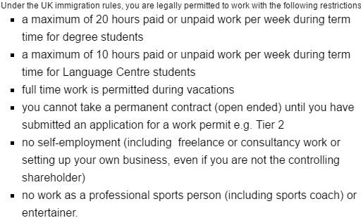 英国奖学金没有那么好申请,勤工俭学成为大家一个减轻经济负担的好办法。绝大部分英国留学生都有打工的机会,而且不用申请特别的工作许可,中国留学生在英国兼职的选择还是比较多的,例如在餐厅做服务生,在学校的一些部门,例如商店、邮局找到文职工作,也可以在社区里找到一些社工服务类的兼职。而一些能发挥中国传统特色优势的工作,例如中文家教、教外国人中国功夫等,也很适合兼职,锻炼一下自己。 但是留学生的工作性质、范围和工作时间是有严格规定的,如果工作时间过长或者做了规定之外的工作,UK Border Agency可能会给出拒签或者是被遣送回国的处理。一般来说,预科和大学在读的学生每周工作时间不能超过20个小时,其他类别和未成年学生每周为10小时,在寒暑假期间工作时间不受限制。 1)工作许可:可查看护照上的签证、入境戳印、移民盖章 允许/限制:“不享有公共基金福利待遇,工作及任何变动必须得到批准(No recourse to public funds.work and any changes must be authorized)。” 禁止:“work prohibited”或“no work” 2)课程时间少于6个月的(即Short-term Student visa)不允许打工 3)年龄限制:16岁以上 16-18岁每周打工时间不得超过10小时 18岁以上每周不超过20小时 假期无限制 4)不允许从事个体户、永久全职工作以及艺术类(明星)工作;表演专业课程相关学生需得到学校具体安排 5)报税:打工需要申请National Insurance Number(英国国家社会保险号) 6)时薪:21岁以上7.05便士起
