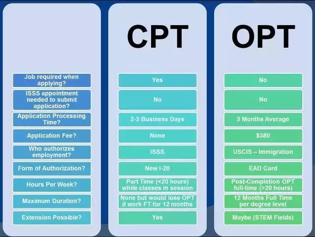 在上学期间,完成大部分课程以后,或者在假期期间,美国大学可以提供 CPT (课程实习训练),时间总和是一年,可以分几次使用。CPT 是美国大学的实习项目,在 CPT 期间,学生是 Fulltime Position,和实习所在公司或机构的员工享有同等待遇。CPT 不但可以在金钱上满足留学生的生活,对毕业以后找工作也非常有帮助。但是原则上,CPT 的工作必须与所学专业相关。