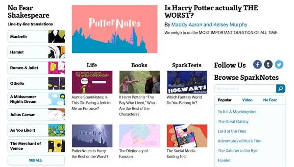读不懂文学?英文文章看得晕头转向?快来sparknotes!这是美国著名的文学网,提供了海量优质的文学指南学习资料,包括作家简介,作品介绍,写作特色,人物分析,关键问题解析等等,其中的sparklife深受美国学生欢迎,更被网友称为神一般的存在!