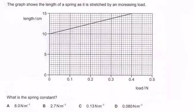 The gradient of extension-load graph is 1/spring constant. The gradient is 0.125, so the spring constant is 8N/m.