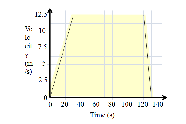 速度—时间图表示的是速度随时间的变化,其中线段的斜率代表的是物体行进中的加速度(acceleration),而线段与横轴围成的面积则代表物体的位移。从上图中,我们可以看出这个物体在前30 s里,进行的是一个加速度恒定的匀加速运动,加速度为12.5/30= 0.417 m/s2;中间30~120 s内速度没有变化,说明物体在这段时间内处于匀速运动状态。而在后10 s 内,物体进行的是一个加速度恒定的匀减速运动,加速度为-12.5/10= -1.25 m/s2 。这里要注意的是加速度也是矢量,有方向,所以数值可能为负。在整个过程中物体移动的位移为(130+90)*12.5/2=1375m