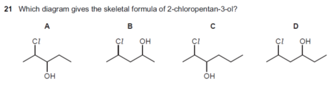 解析:这道题考察的是有机分子的命名法。从penta-可以看出有5个碳原子,排除C和D,再从2号碳原子连氯原子,3号碳原子连-OH可以判断正确答案是A。