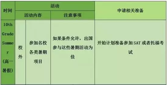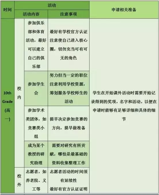 10年级:不再参加过多的课外活动,而是集中于三、四个项目或自己真正感兴趣的领域,追求课外活动的质量,尽量参加全国性、国际性的高含金量活动。