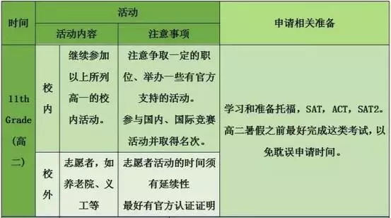 11年级:当你升入11年级,你要确实地参加你最喜欢、最感兴趣的活动之中。如果你尚没有参加什么活动,赶紧着手做也为时不晚。而且,在活动中也要有自己的特色,比如作为指挥者或领导者,不能仅仅满足于做一个普通成员;同时,须仍然注重所参与活动的含金量,确保其能够在日后的申请过程中为自己加分。