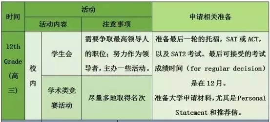12年级:由于申请本身要占据大量的课余时间,所以要确保你参加的课外活动都是你真正喜欢的并对你来说是有意义的。