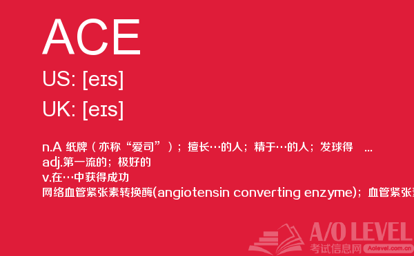 目前,a/olevel逐渐为人所熟知,很多学生都会主动了解alevel考试流程。同时也会抱怨a-level英语题比较难,任务重。那现在我们就放松一下,跟着a/o-level考试网小编来看看a-level考试中要积累的单词ACE,认真的学习积累。如果您想了解alevel时间,alevel考试报名费,国内学alevel要多少钱,alevel化学等关于a-level考试的相关资讯,请继续浏览并关注课窝a/o-level考试网。