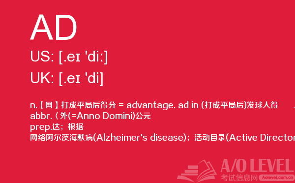 a-level课程包含70多门供学生选择,一般学生选择3至4门来学,中国学生在数学学科上有很大的优势,一般学生都会选择基础数学。学生选择课程时,一般要考虑现在自己的优势科目和将来的发展方向,即你想选择哪个大学、什么专业,从而根据他们的要求有的放矢地选课。关于alevel选课后续会详细介绍,下面带来a-level考试词汇AD的详细介绍。如果您想了解alevel怎么自学,a水准数学,alevel考试指南,alevel自学选什么等关于a-level考试的相关资讯,请继续浏览并关注课窝a/o-level考试网。