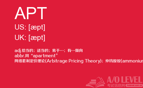 今天课窝a/o-level考试网小编给大家带来alevel考试至关重要的内容a-level单词APT的详细介绍。希望大家能够认真的阅读,在备考a-level中会用到,关于a-level考试时间,alevel考试费用等相关问题,可以关注课窝a/o-level考试网。如果您想了解交大alevel学费,新加坡大学alevel,alevel考试网,alevel词汇等关于a-level考试的相关资讯,请继续浏览并关注课窝a/o-level考试网。