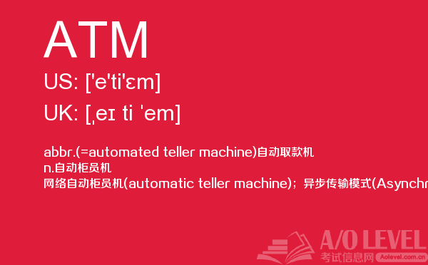 英国a-level学校,从教学质量上来看私立学校更占优势,大部分中国留学生也选择私立学校来读,不过一般都是提前一年来申请学校。中国目前也有20几所a-level学校,每年也同样有走进剑桥牛津等世界顶级大学的学生。所以在国外和在国内都可以选择a-level学校来学习。在前面关于a-level选校的问题已经详细介绍过,那么今天a/o-level考试网小编主要想介绍的是a-level重难点词汇ATM。希望对大家有帮助。如果您想了解alevel培训哪家好,南京alevel,alevel英语是什么,alevel等关于a-level考试的相关资讯,请继续浏览并关注课窝a/o-level考试网。