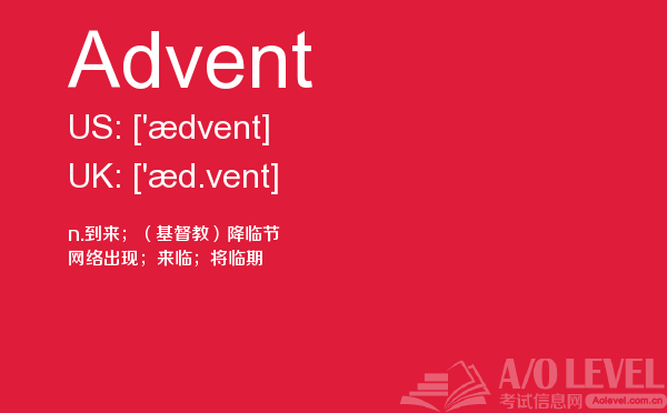 英国a-level入学考试的机会真的很少,每年就5-6月和10-11月两场考试。所以千万别因为不必要的原因,影响了a-level入学考试。为了让大家更好的在英国留学,a/o-level考试网会为大家带来a-level考试相关的资讯,一起来看看a/o-level考试网今天带来的词汇Advent的解析。如果您想了解alevel物理真题,高三毕业能读alevel吗,alevel剑桥,alevel报名流程等关于a-level考试的相关资讯,请继续浏览并关注课窝a/o-level考试网。