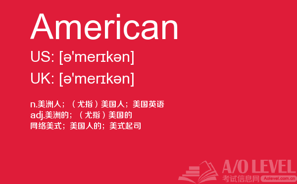 英国a-level入学考试的机会真的很少,每年就5-6月和10-11月两场考试。所以千万别因为不必要的原因,影响了a-level入学考试。为了让大家更好的在英国留学,a/o-level考试网会为大家带来a-level考试相关的资讯,一起来看看a/o-level考试网今天带来的词汇American的解析。如果您想了解alevel课程选课,上海alevel中心,英国中学排名alevel,alevel课程难吗等关于a-level考试的相关资讯,请继续浏览并关注课窝a/o-level考试网。