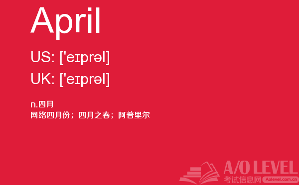 现在很多人来咨询a-level考试录取率,英国a-level考试题库的家长也依然不减,而考生们则更关心a-level教材以及a-level考试培训课程是什么样的。a/o-level考试网都会解答您。今天小编带来a/o-level考试网的内容是关于a-level词汇的April单词的详细介绍。如果您想了解alevel水平考试,alevel考试时间表,爱德思alevel真题,alevel数学大纲等关于a-level考试的相关资讯,请继续浏览并关注课窝a/o-level考试网。