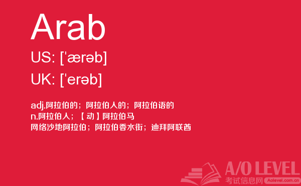 英国a-level入学考试的机会真的很少,每年就5-6月和10-11月两场考试。所以千万别因为不必要的原因,影响了a-level入学考试。为了让大家更好的在英国留学,a/o-level考试网会为大家带来a-level考试相关的资讯,一起来看看a/o-level考试网今天带来的词汇Arab的解析。如果您想了解如何成为alevel老师,alevel补习,alevel数学教材有几本书,alevel数学评分标准等关于a-level考试的相关资讯,请继续浏览并关注课窝a/o-level考试网。
