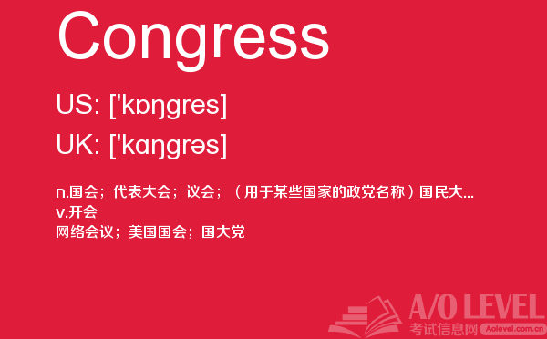a-level 的考试将由所属的考试委员会分别于每年5-6月和10-11月在全球统一组织,成绩分别在8月和次年2月公布。关于a-level考试时间的具体内容,alevel考试网前面详细介绍过,大家可以查找alevel考试网前面的a-level考试资讯,alevel考试网每天会更新大量的alevel考试资讯,本篇要给大家介绍a-level单词Congress的全面介绍。如果您想了解alevel培训哪家好,剑桥alevel课程,新加坡a水准,alevel真题试卷等关于a-level考试的相关资讯,请继续浏览并关注课窝a/o-level考试网。