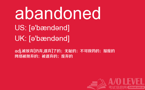 英国高中课程(A-Level)的学制为两年:第一年称为AS水准,学生通常选择自己最擅长且最有兴趣的3—4门课,通过考试后获得AS证书。第二年称为A2水准,学生可选择AS水准中优秀的3门课继续学习,通过考试后获得A-Level证书。关于A-level学制相信大家肯定有一定的了解,今天alevel考试网想要带大家了解的并不是A-level学制的问题,想要介绍的是A-level重难点单词abandoned,希望对大家有帮助。如果您想了解alevel课程选课,考alevel多少钱,上海alevel辅导哪家好,alevel经济考试原题等关于A-level考试的相关资讯,请继续浏览并关注课窝A/O-level考试网。