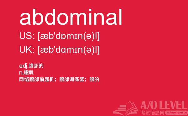 A-Level(General Certificate of Education Advanced Level ),英国高中课程,是英国全民课程体系,是英国普通中等教育证书考试高级水平课程,也是英国学生的大学入学考试课程。今天alevel考试网小编给大家带来的alevel考试单词abdominal的详细介绍。希望大家能够认真的阅读。如果您想了解alevel教育网,在线alevel辅导,bc和alevel哪个好,alevel物理真题等关于A-level考试的相关资讯,请继续浏览并关注课窝A/O-level考试网。