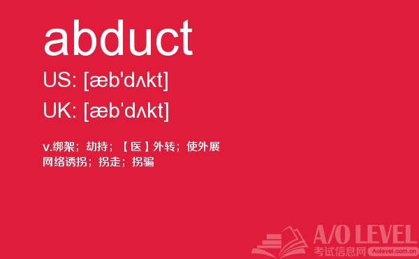 今天课窝A/O-level考试网小编给大家带来alevel考试至关重要的内容A-level单词abduct的详细介绍。希望大家能够认真的阅读,在备考A-level中会用到,关于A-level考试时间,alevel考试费用等相关问题,可以关注课窝A/O-level考试网。如果您想了解大连alevel课程,美国有alevel课程吗,alevel培训哪家好,alevel能不能代替sat等关于A-level考试的相关资讯,请继续浏览并关注课窝A/O-level考试网。
