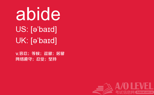 A-Level 的考试将由所属的考试委员会分别于每年5-6月和10-11月在全球统一组织,成绩分别在8月和次年2月公布。关于A-level考试时间的具体内容,alevel考试网前面详细介绍过,大家可以查找alevel考试网前面的A-level考试资讯,alevel考试网每天会更新大量的alevel考试资讯,本篇要给大家介绍A-level单词abide的全面介绍。如果您想了解alevel课程如何升大学,alevel零基础,a水准物理专业术语,上海alevel排名等关于A-level考试的相关资讯,请继续浏览并关注课窝A/O-level考试网。