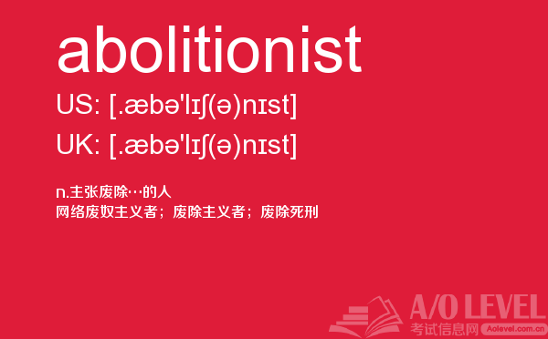 A-Level课程证书被几乎所有英语授课的大学作为招收新生的入学标准。 在中国开设A-Level课程旨在为中国学生提供进入国外大学的有效途径,具体目标为:培养在国内初高中成绩优秀的学生进入世界顶尖大学;培养在国内初高中成绩中等的学生进入世界一流大学;培养在国内初高中成绩一般的学生考取适合自己的大学。今天alevel考试网小编给大家详细解析A-level考试单词abolitionist。如果您想了解国内alevel培训,alevel历年考试,alevel学校考试难度,alevel报考等关于A-level考试的相关资讯,请继续浏览并关注课窝A/O-level考试网。