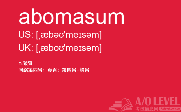 就读于国内学校的学生, 在申请英国学校时需要提交英国A-level考试成绩。很多考生因此英国A-level考试搞得头疼,放松一下,跟着A/O-level考试网来看看英国留学资讯吧!今天课窝A/O-level考试网小编给大家带来A-level考试重点词汇abomasum的全解,对你肯定有帮助。如果您想了解alevel双语教材,alevel写作分数,爱德思alevel申请大学,alevel考试教材等关于A-level考试的相关资讯,请继续浏览并关注课窝A/O-level考试网。