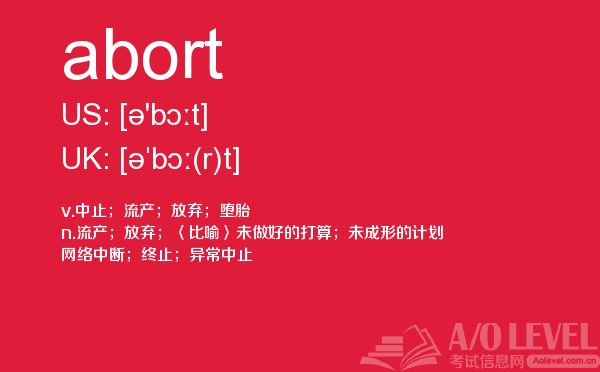 英国以其高质量的教学闻名于世,如果你还在思考a-level考试值不值得考?近几年的英国留学a-level考试的热潮足以证明一切!课窝a/o-level考试网会给大家带来a-level考试真题,a-level考试如何复习?等所有有关的a-level考试资讯。课窝a/o-level考试网今天带来a-level考试中很重要的单词abort的详细解析,会对你有帮助。如果您想了解alevel报名,alevel申请美国大学,爱德斯alevel,新加坡a水准考试培训机构等关于a-level考试的相关资讯,请继续浏览并关注课窝a/o-level考试网。