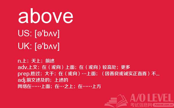 a-level课程证书被几乎所有英语授课的大学作为招收新生的入学标准。 在中国开设a-level课程旨在为中国学生提供进入国外大学的有效途径,具体目标为:培养在国内初高中成绩优秀的学生进入世界顶尖大学;培养在国内初高中成绩中等的学生进入世界一流大学;培养在国内初高中成绩一般的学生考取适合自己的大学。今天alevel考试网小编给大家详细解析a-level考试单词above。如果您想了解中国alevel成绩申请国外名校,alevel数学名词,英国alevel成绩只有c,alevel申请条件等关于a-level考试的相关资讯,请继续浏览并关注课窝a/o-level考试网。