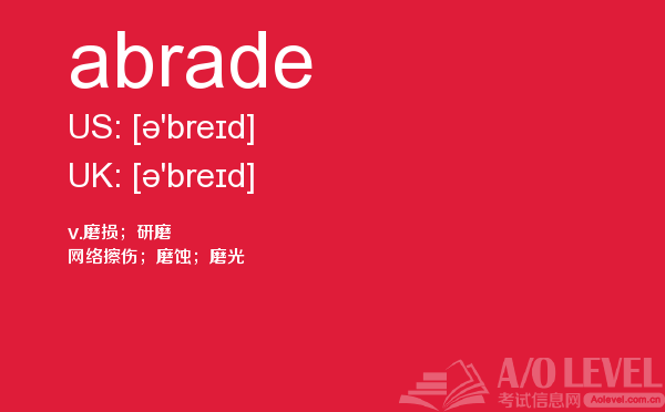 随著学生的素质提升,各大A-level课程培训班的师资和英国A-level题库也不断的完善,近年来学生考出来A-level分数也不断上涨。但是去英国留学,对英国留学资讯和英国的A-level考试资讯都是需要了解的,下面一起跟着A/O-level考试网来看看A-level词汇之abrade的详细介绍。如果您想了解爱德思alevel申请大学,爱德思alevel考试答案,alevel数学公式,alevel中国等关于A-level考试的相关资讯,请继续浏览并关注课窝A/O-level考试网。