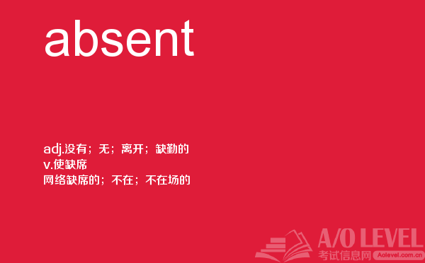 a-level课程证书被几乎所有英语授课的大学作为招收新生的入学标准。 在中国开设a-level课程旨在为中国学生提供进入国外大学的有效途径,具体目标为:培养在国内初高中成绩优秀的学生进入世界顶尖大学;培养在国内初高中成绩中等的学生进入世界一流大学;培养在国内初高中成绩一般的学生考取适合自己的大学。今天alevel考试网小编给大家详细解析a-level考试单词absent。如果您想了解国内alevel培训,alevel历年考试,alevel学校考试难度,alevel报考等关于a-level考试的相关资讯,请继续浏览并关注课窝a/o-level考试网。