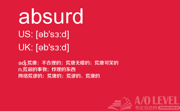 英国a-level学校,从教学质量上来看私立学校更占优势,大部分中国留学生也选择私立学校来读,不过一般都是提前一年来申请学校。中国目前也有20几所a-level学校,每年也同样有走进剑桥牛津等世界顶级大学的学生。所以在国外和在国内都可以选择a-level学校来学习。在前面关于a-level选校的问题已经详细介绍过,那么今天a/o-level考试网小编主要想介绍的是a-level重难点词汇absurd。希望对大家有帮助。如果您想了解alevel作用,alevel考试中心英国,alevel咨询中心,香港大学alevel成绩申请等关于a-level考试的相关资讯,请继续浏览并关注课窝a/o-level考试网。