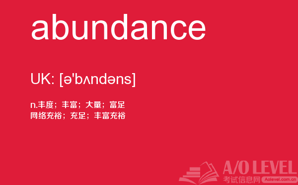 虽然英国a-level院校招生官常把“成绩不是决定录取与否的唯一因素”挂在嘴边,但不得不承认,a-level分数是学生优秀与否的有力证据,取得a-level成绩高分是肯定是优先考虑的。放松一下,先跟着a/o-level考试网来看看今天小编带来的是a-level单词abundance的介绍。如果您想了解alevel是什么意思,alevel课程怎么申请,alevel自学考几门,在线alevel辅导等关于a-level考试的相关资讯,请继续浏览并关注课窝a/o-level考试网。