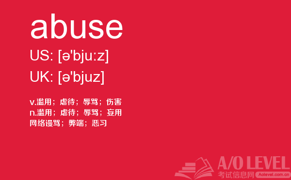 在a-level备考的过程中,想要冲刺到a-level写作的高分,相信大家都应该会知道,除了需要掌握a-level写作的一些技巧之外,优化文章中的词汇和句型也是冲刺高分的关键所在。也就是说,只有充分掌握了语法知识,才能让我们的的文章更为丰富形象。除了a-level写作,在a-level其他方面同学们也需要了解,下面课窝a/o-level考试网小编给大家带来a-level单词abuse的介绍。如果您想了解a水准考试预备班怎么样,化学alevel2018,alevel官方介绍,alevel课程选课等关于a-level考试的相关资讯,请继续浏览并关注课窝a/o-level考试网。