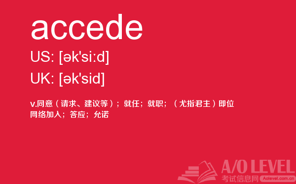 随著学生的素质提升,各大a-level课程培训班的师资和英国a-level题库也不断的完善,近年来学生考出来a-level分数也不断上涨。但是去英国留学,对英国留学资讯和英国的a-level考试资讯都是需要了解的,下面一起跟着a/o-level考试网来看看a-level词汇之accede的详细介绍。如果您想了解了解alevel培训,国际部高中课程alevel,查询alevel考试报名信息2018,墨尔本大学alevel要求等关于a-level考试的相关资讯,请继续浏览并关注课窝a/o-level考试网。
