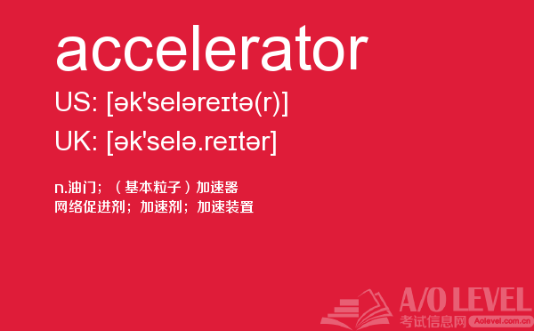 a-level课程适用于年龄在15—18之间,初中毕业以上的在校中学生或具有同等学历的职高生,通常国内a-level学校招收的是高二毕业的学生,并要求参加相关的入学考试,由于a-level课程包括教学及试卷习题等都是英文形式出现,所以这要求学生有较高的英文水平。对于a-level考试适用对象有初步了解之后,下面alevel考试网给大家带来的alevel考试中你需要重点记住的单词accelerator的详细介绍。如果您想了解alevel考试指南,alevel课程有年龄限制,alevel真题下载,英国alevel考试试卷等关于a-level考试的相关资讯,请继续浏览并关注课窝a/o-level考试网。