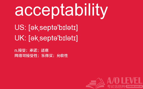 英国留学对于留学成绩的比拼越来越激烈,申请英国院校留学的一大指标a-level考试分数要求也水涨船高.虽然成绩只是申请的一部分,但不得不说,好看的英国a-level成绩是学生是否优秀的证据。放松一下跟着a/o-level考试网来学习一下a-level考试词汇acceptability的应用。如果您想了解alevel考试机经,alevel真题试卷,alevel都有什么课程,alevel课程多久等关于a-level考试的相关资讯,请继续浏览并关注课窝a/o-level考试网。