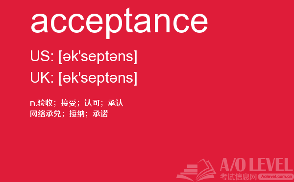 英国高中课程(a-level)的学制为两年:第一年称为as水准,学生通常选择自己最擅长且最有兴趣的3—4门课,通过考试后获得as证书。第二年称为a2水准,学生可选择as水准中优秀的3门课继续学习,通过考试后获得a-level证书。关于a-level学制相信大家肯定有一定的了解,今天alevel考试网想要带大家了解的并不是a-level学制的问题,想要介绍的是a-level重难点单词acceptance,希望对大家有帮助。如果您想了解alevel哲学,新加坡a水准考试,alevel课程能复读吗,中国alevel等关于a-level考试的相关资讯,请继续浏览并关注课窝a/o-level考试网。