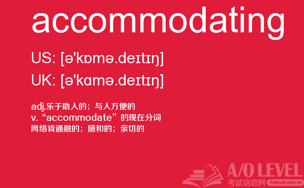 在a-level备考的过程中,想要冲刺到a-level写作的高分,相信大家都应该会知道,除了需要掌握a-level写作的一些技巧之外,优化文章中的词汇和句型也是冲刺高分的关键所在。也就是说,只有充分掌握了语法知识,才能让我们的的文章更为丰富形象。除了a-level写作,在a-level其他方面同学们也需要了解,下面课窝a/o-level考试网小编给大家带来a-level单词accommodating的介绍。如果您想了解alevel写作真题,alevel写作分数,新加坡a水准报名费,新alevel等关于a-level考试的相关资讯,请继续浏览并关注课窝a/o-level考试网。