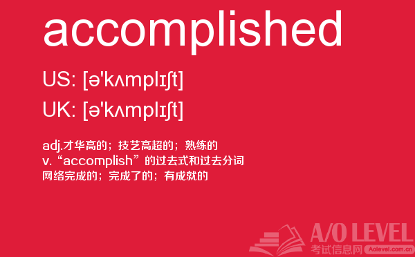 目前,a/olevel逐渐为人所熟知,很多学生都会主动了解alevel考试流程。同时也会抱怨a-level英语题比较难,任务重。那现在我们就放松一下,跟着a/o-level考试网小编来看看a-level考试中要积累的单词accomplished,认真的学习积累。如果您想了解a水准考试报名,alevel化学实验,上海alevel课程,alevel可以申请哪里等关于a-level考试的相关资讯,请继续浏览并关注课窝a/o-level考试网。