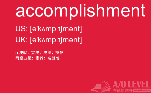 现在申请英国院校的中国孩子非常多,几乎每一个学生都在为一种叫做英国a-level的考试而努力着。a/o-level考试网老师为大家解析a-level考试重难点单词accomplishment,大家认真学习,会有帮助。如果您想了解英国alevel考试时间,新加坡alevel考试几月,alevel辅导上海,alevel报名条件等关于a-level考试的相关资讯,请继续浏览并关注课窝a/o-level考试网。