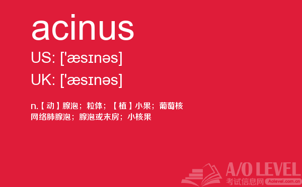 众多周知的英国a-level入学考试是进入英国院校的必经之路,所以我们自然不能小看,建议同学们能够加强a-level考试真题的练习,提前明确英国a-level考试报名的具体信息。为了提高考生们的英国a-level考试成绩,a/o-level考试网小编会每天给大家更新a-level留学资讯和alevel考试资讯,今天带来的是关于a-level考试词汇的单词全解,下面带你学习acinus的用法。如果您想了解中国alevel人数,alevel考试用品,alevel经济,alevel考试年龄等关于a-level考试的相关资讯,请继续浏览并关注课窝a/o-level考试网。