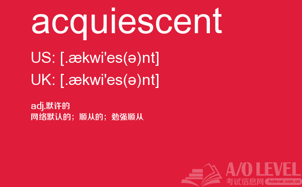 英国a-level考试是英国留学生去英国留学需要参加的考试,很多考生担心a-level考试分数要求高,英国a-level考试难度大,别担心,只要认真的学习a-level考试内容,小编相信大家一定能够考得a-level高分。今天a/o-level考试网给大家带来单词acquiescent的全面解析。如果您想了解中国alevel成绩申请国外名校,alevel数学名词,英国alevel成绩只有c,alevel申请条件等关于a-level考试的相关资讯,请继续浏览并关注课窝a/o-level考试网。