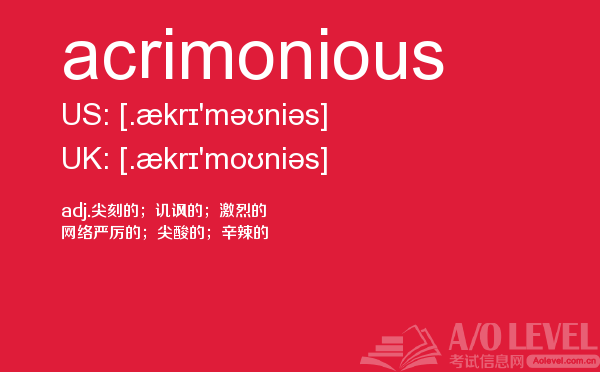 目前,a/olevel逐渐为人所熟知,很多学生都会主动了解alevel考试流程。同时也会抱怨a-level英语题比较难,任务重。那现在我们就放松一下,跟着a/o-level考试网小编来看看a-level考试中要积累的单词acrimonious,认真的学习积累。如果您想了解alevel词汇表,alevel生物难度,申请新加坡a水准,alevel作文等关于a-level考试的相关资讯,请继续浏览并关注课窝a/o-level考试网。