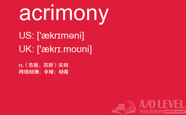 随着英国留学申请竞争的白热化,a-level成绩在学生个人简历中扮演的“入场券”角色,变得越来越重要。然而,在你参加a-level考试培训班前,你首先要对a-level考试有着一定的了解,一起跟着a/o-level考试网来看看小编今天带来a-level单词acrimony的详细介绍。如果您想了解alevel试卷,上海alevel辅导,alevel入学考试,alevel化学关键词等关于a-level考试的相关资讯,请继续浏览并关注课窝a/o-level考试网。